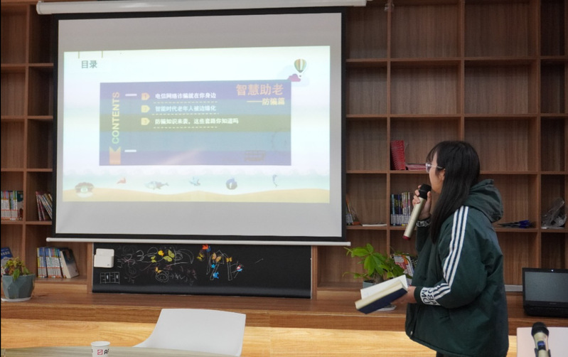 志愿者郝宇晨,向老人们讲述智能设备使用过程中可能遇到的问题,以及信息时代的常见骗术。提醒老人们不轻信未经鉴别的消息来源,另一方面,也需要子女们的陪伴和关注,才能让骗子没有可乘之机。