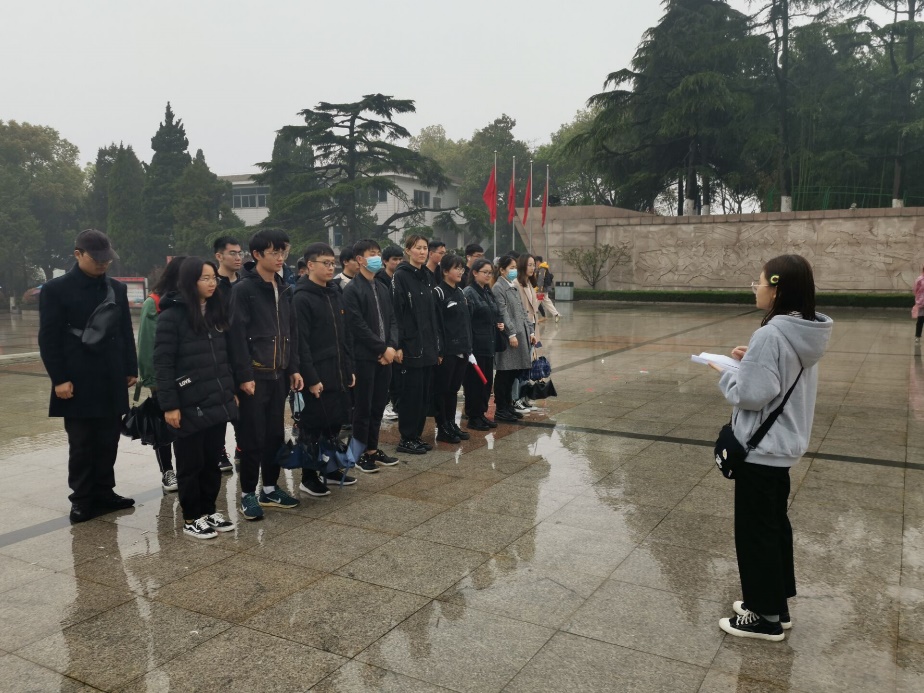 烟雨迷蒙中,同学们迈着沉重的步伐来到位于陵园西侧的烈士墓——这里安葬着许多英灵,上到抗战时期牺牲的革命先烈,下至南斯拉夫大使馆被轰炸时牺牲的同胞,他们全都长眠于此——时刻警示后人勿忘历史!在献花、默哀后,由义工代表郭沛蓉向革命先烈致悼词,沉重的文字诉说后人无限的追思和敬仰。随后大家来到纪念碑下,重温入团誓词,坚定信念,笃定前行。