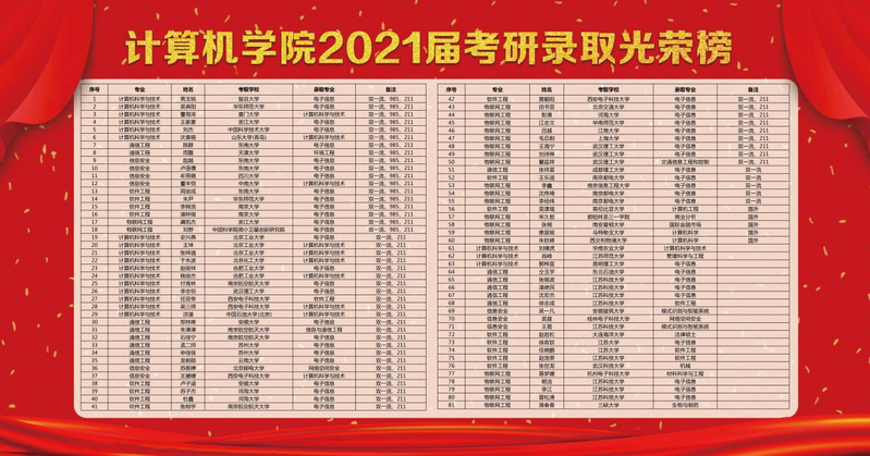考研捷报传,桃李尽芬芳。随着全国硕士研究生录取工作进入收尾阶段,我院考研学子喜讯频传。2021年,在学院领导的大力关心与支持以及全体师生的共同努力下,计算机学院2021届毕业生升学深造再续辉煌。