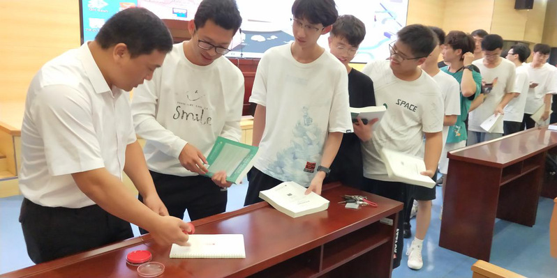 讲座开始前,主讲人徐宿浒热情邀请同学们带上自己课本盖章,并向同学们介绍:该印章的篆书格式字体为赛珍珠女士亲自设计,体现了赛珍珠对中国传统文化的热爱,兼具社会价值与艺术性,此举极大地调动同学们学习了解镇江本土文化的热情。