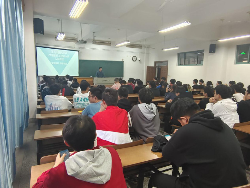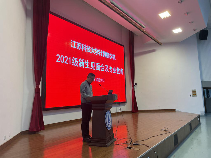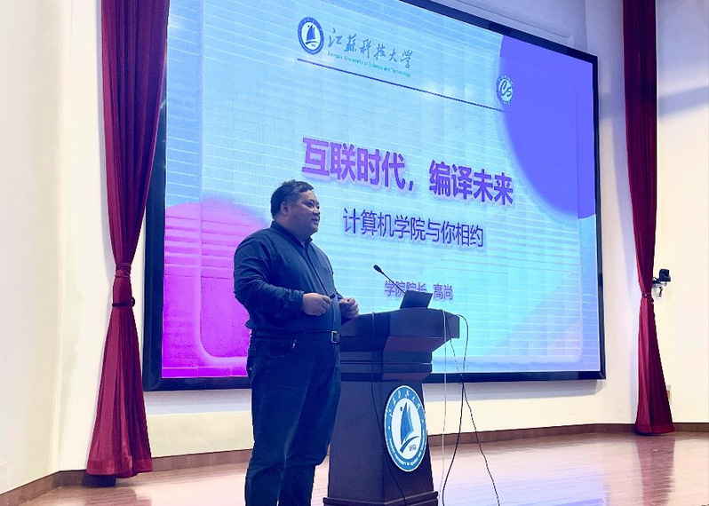 计算机学院院长高尚老师以“互联时代,编译未来”为主题,从学院各专业情况、学科竞赛、杰出校友等方面介绍了学院的整体近况。当提及镇江当地文化,高院长希望同学们可以了解美丽古城镇江的悠久历史,提高对镇江本土文化的认识,树立自强不息的人生观和价值观。