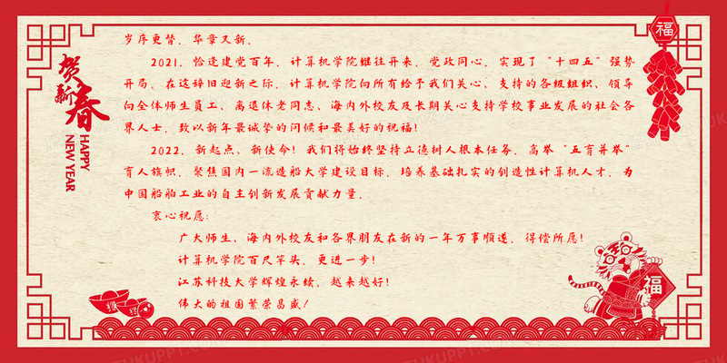 2021,恰逢建党百年,计算机学院继往开来,党政同心,实现了““十四五””强势开局。在这辞旧迎新之际,计算机学院向所有给予我们关心,支持的各级组织、领导向全体师生员工、离退休老同志,海内外校友及长期关心支持学校事业发展的社会各界人士,致以新年最诚挚的问候和最美好的祝福!
