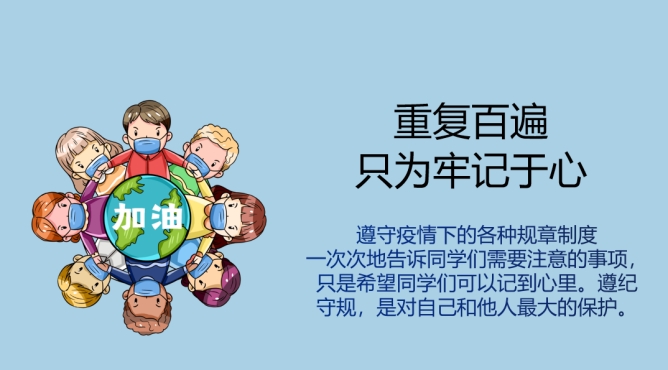 遵守疫情下的各种规章制度。遵守校纪校规,违法乱纪的事不做。在校期间专注学习,不要胡思乱想,远离负面情绪。