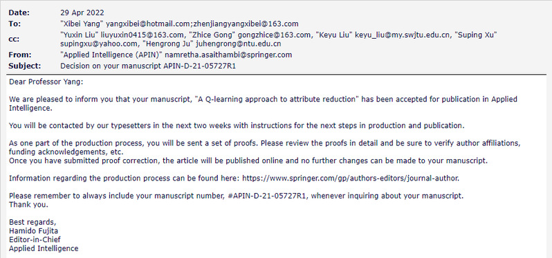 4月29日,计算机学院19级软件工程专业本科生撰写的论文《A Q-learning approach to attribute reduction》被SCI二区期刊Applied Intelligence录用,本科生刘雨鑫为第一作者、龚之策为第二作者。Applied Intelligence目前是JCR分区Q1、中科院SCI二区(2021年12月最新升级版)期刊,最新影响因子为5.086。
