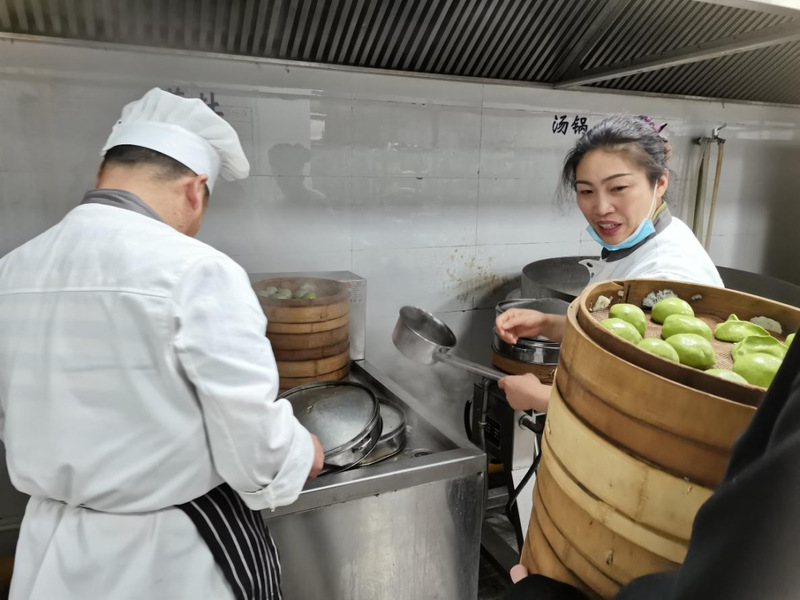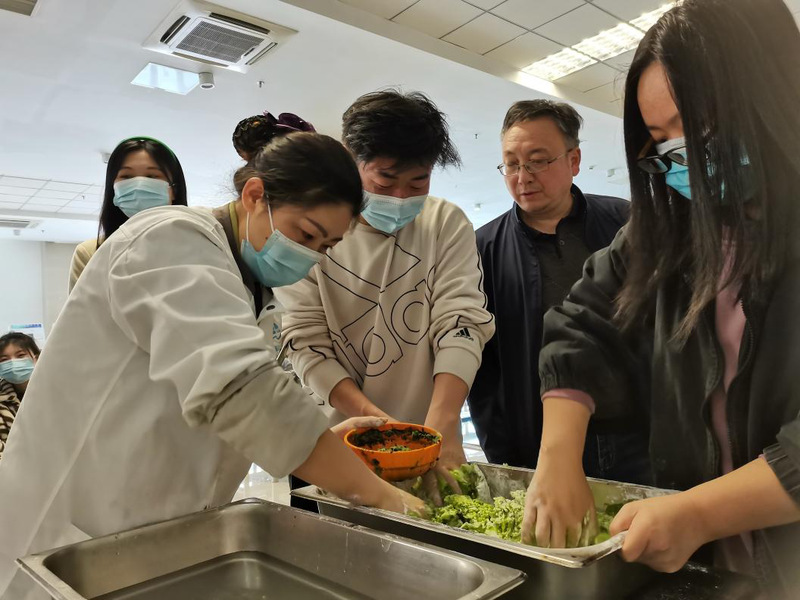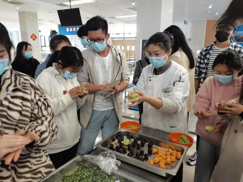 活动现场欢声笑语,食堂阿姨给同学们现场教学如何包青团,大家一边制作青团,一边聊起清明的其它特色民俗,空气中混着艾草的独特清香。同学们也邀请食堂阿姨一起品尝劳动成果,对他们平时的辛苦付出表示感谢!