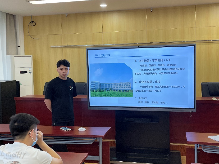 最后,数学建模竞赛优秀学生代表叶赵兵同学,为大家带来了竞赛经验分享。过程中,叶赵兵同学建议同学们备赛期间主动加强与导师的沟通,处理好备赛与专业学习的关系,比赛前认真研读比赛规则;比赛过程中既要明确任务分工,更要发扬团队协作精神,带上细心与信心,沉着应对,全力以赴,定能取得令自己满意的成绩。