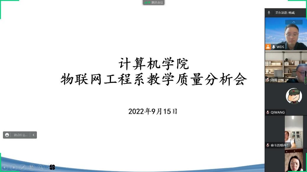 2022年9月15日下午14:00,计算机学院物联网工程系召开了线上教学质量分析会(由于台风影响,采用线上形式进行),组织系里所有教师认真学习了学校发布的《关于公布2021年度本科专业办学监测预警弱项的通知》文件,针对物联网工程专业中出现的问题进行了详细研讨,教师们一致认为:(1)趁着2022大纲修订的机会,需要对专业课程进行全面、重新梳理。课程大纲需要进行开会统一讨论,避免课程间内容重复过多。(2)实验/实践环节,也要和实验室教师沟通。实验大纲也存在同样问题,内容避免重复过多。(3)系部组织物联网工程专业学生进行教学调研,了解学生有哪些述求,要充分满足学生的需求,听取学生的意见。(4)最后,物联网工程专业所有的教学资料、教学过程等都要对标工程认证。(5)从往年的期中教学反馈来看,有部分学生对物联网工程专业认可度不够,导致学生对物联网工程专业学习、课程设置比较迷茫,在下一步工作中,需要学工、班主任、实验室、专业教师互相配合,尤其是专业负责人,在专业教育宣贯时,要着力提高学生对物联网工程专业的认可度。(6)动员系部教师的博士期间的师弟师妹等积极申请学院的相关职位,提高师生比。(7)培养方案这几年一直在重构,教师所承担的课程也在不断变化,导致教师会一直承担一些新课,教师需要付出更多的精力,给教师也带来了很多的压力,希望后续能够逐步稳定专业的核心课程群。(8)系里的教研活动今年来稍有弱化,希望在后续能够加强教研室的教学研讨活动,加强教师之间教研教改方面的交流。