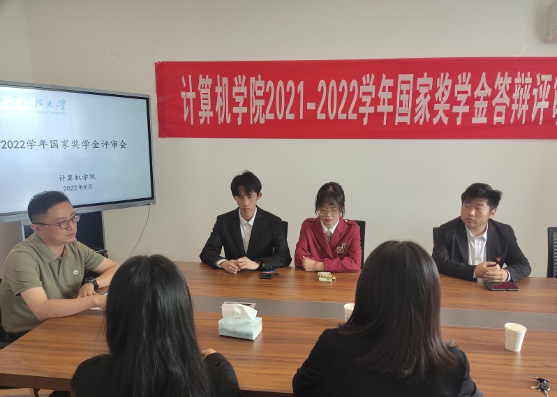 为切实开展2021-2022学年国家奖学金的评审工作,深入学习贯彻习近平总书记对本科生教育工作做出的重要指示批示和全国本科生教育会议精神,以提升本科生教育质量为核心,积极营造良好学习环境,计算机学院于9月21日上午在学院314会议室举行2022年本科生国家奖学金答辩评审会。学院党委副书记吴健康老师、教师代表黄士新老师、潘磊老师及学工办张苏婷老师和秦键老师担任评委。