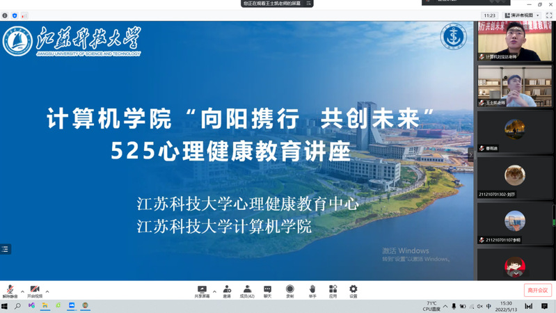5月13日下午,由江苏科技大学心理健康教育中心、新利体育(中国)官方网站,登录入口主办的“向阳携行,共创未来”525心理健康教育讲座在计算机学院320会议室顺利开展。本次讲座通过“线上+线下”双平台,邀请校心理健康教育中心专职教师王士凯老师进行《掌握快乐密码之认识内心自我》主题宣讲,旨在帮助同学认识内心自我,驱散烦恼,拒绝迷茫,化解负面情绪,增强抗压能力,重点珍视生命价值。会议由计算机学院心理辅导员刘宝达老师主持,各班级生活委员、心理委员、文体委员及萤火虫义工站义工共五十余人线下参加,近100名同学线上参与。