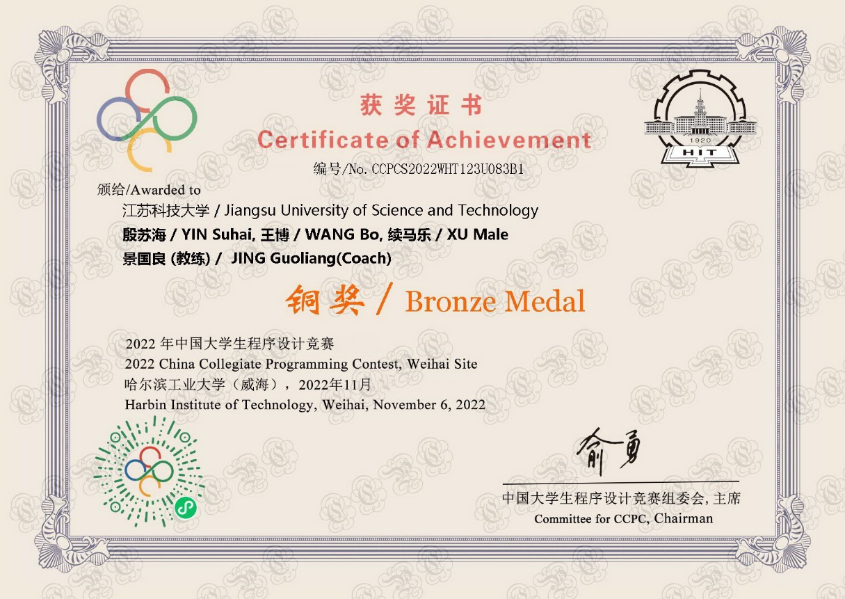 近日,第8届中国大学生程序设计竞赛在哈尔滨工业大学(威海)顺利举行。来自全国161所高校的278支队伍同场竞技,双一流高校悉数参加。江苏科技大学在9月初举行的预赛中从2800多支队伍中脱颖而出,进入全国赛,经过两天智力与体力的激战,面对来自全国包括清华大学、北京大学、复旦大学、上海交通大学、南京大学、浙江大学等在内许多名校计算机顶尖人才,由计算机学院殷苏海、王博、续马乐三位同学组成的队伍在教练景国良老师的带领下戒骄戒躁,勇于拼搏,最终勇夺铜奖。