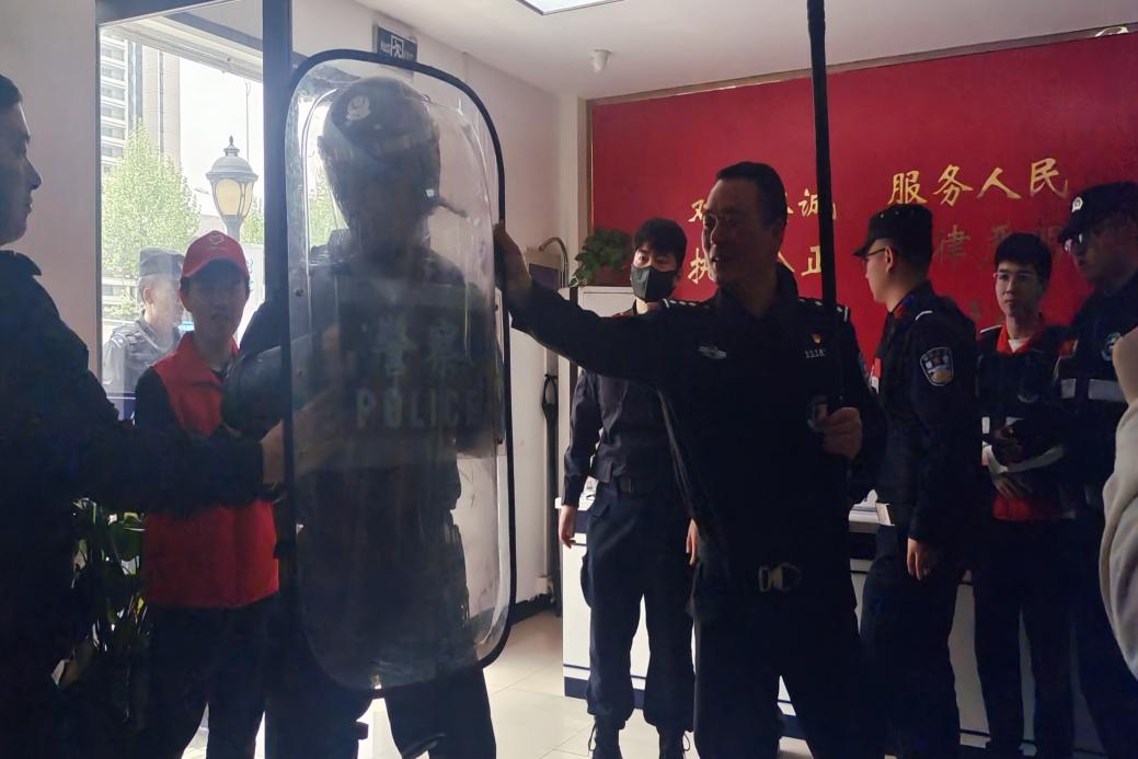 巡逻结束后,大家返回警务站集合。特警同志召集大家认识并试戴警务站所配备的装备,同时详细为大家解释了装备用途。其中一名成员试穿了警务工作站的防爆服,并在特警同志的帮助下体验了盾牌和棍棒制服敌人的正确做法。