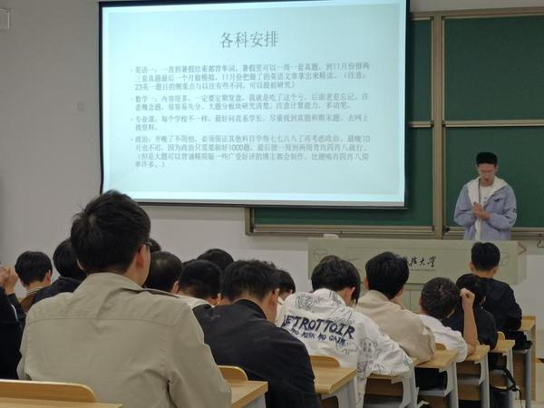 刘林松,拟录取于西安电子科技大学,攻读人工智能专业的学硕学位。刘林松主要是从各科安排和心态两个方面分享经验,他尤其注重心态问题,在他的激励的话语中,在场同学斗志昂扬,可谓少年自有凌云志,不负黄河万古流。