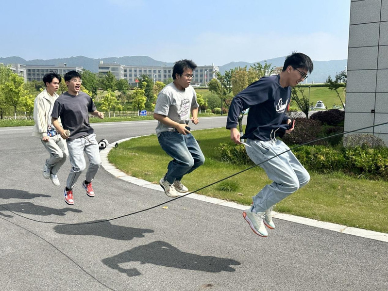 画面切转到,图书馆辅楼处,在这里工作人员手持细绳,引导同学们齐心协力跳起了欢快的大绳舞,场面欢声笑语、快乐无比。