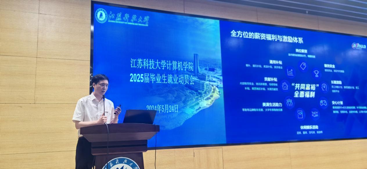 大会最后,企业代表进行岗位推介。本次大会学院邀请了浙江大华技术股份有限公司、珍岛信息技术(上海)股份有限公司以及江苏科茂信息技术有限公司等企业到场宣讲,企业代表分别就各自的业务范围、企业文化理念、人才培养计划以及福利制度等方面进行了全面而深入的宣讲与介绍。