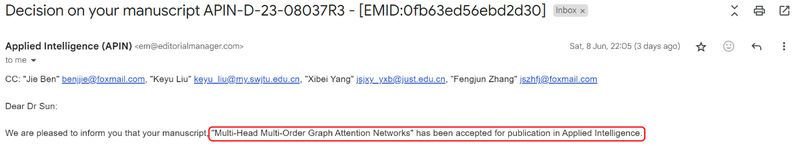 近日,我校计算机学院2021级计算机科学与技术专业本科生贲杰,以第一作者身份撰写的《Multi-Head Multi-Order Graph Attention Networks》研究论文被国际知名期刊《Applied Intelligence》(中科院二区,中国计算机学会推荐C类,影响因子:5.3)录用,江苏科技大学为第一署名单位,学院专职教师孙柒国博士为论文通讯作者,杨习贝教授为论文合作作者。这是我院数据科学与知识工程研究所杨习贝教授团队在图神经网络研究领域获得的又一研究进展,展现了我院在本科生科技创新能力和人才培养方面上取得的显著成效。