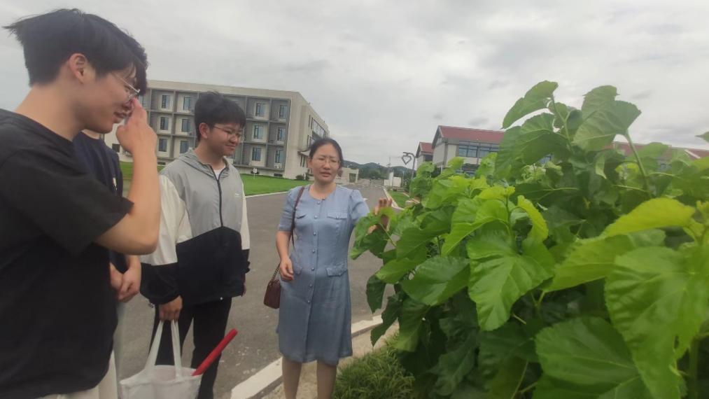 离开蚕室,实践队一行踏入郁郁葱葱的桑田,这里是蚕宝宝赖以生存的后花园。在这片充满生机的土地上,不同品种的桑树错落有致,它们不仅是蚕的食物来源,更承载着丰富的生态智慧。
