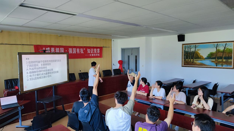 2024 年 9 月 28 日,在这个充满希望与活力的日子里,计算机学院成功举办了一场以“感恩祖国,强国有我”为主题的知识竞赛。此次竞赛旨在激发学生的爱国热情,提高学生的综合素质,同时也为同学们提供了一个展示自我的平台。