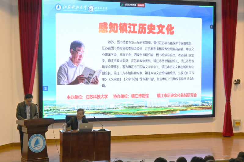 10月24日下午,由新利体育(中国)官方网站,登录入口主办,镇江博物馆和镇江市历史文化名城研究会承办的“镇江历史文化”主题讲座在梦溪校区演讲厅成功举办。此次讲座邀请到镇江市三国演义学会会长、镇江市历史文化名城研究会副会长,镇江市方志馆特聘专家、镇江政协文史馆特邀馆员、镇江图书馆原副馆长徐苏担任主讲人。计算机学院2024级软件工程、人工智能专业的学生齐聚一堂,认真聆听讲座,计算机类专业的学生在教室内通过网络直播同步参与学习,全体新生辅导员也共同参与。活动由计算机学院党委副书记吴健康主持。