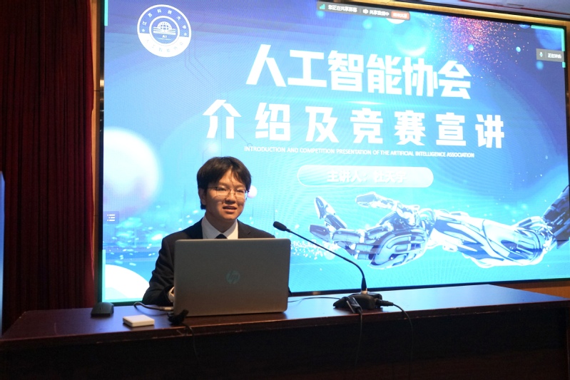 随后,学院人工智能协会的会长杜天宇同学上台,开篇简单介绍了协会内部组织结构以及日常工作内容。紧接着,他将重点聚焦在了竞赛宣讲环节,着重对中国大学生计算机设计大赛进行了全方位的解读。他不仅深入剖析了大赛的赛制规则、内容、评审标准等重要信息,更是通过丰富多样的展示方式,带领大家一同品析了一个又一个优秀的竞赛作品。这些作品犹如璀璨星辰,闪耀着参赛者们的智慧光芒,它们背后所承载的,是一届又一届竞赛人不畏艰难、勇往直前的拼搏精神。这种精神,无疑如同一把火炬,启蒙着每一位大一新生对竞赛的好奇之心,激发起他们内心深处对竞赛的向往与热爱之情。此外他还诚挚地向在场的新生们发出了热情邀请,希望他们成为人工智能协会这个大家庭中的一员,在未来的竞赛征程中,发挥自身的光和热。