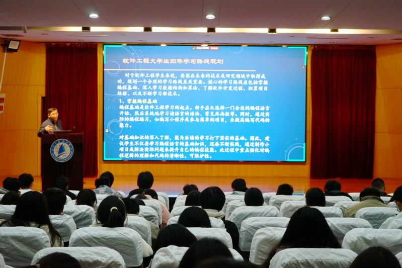 在活动中,束鑫老师以学生熟悉的C/C++、Java和Python等编程语言为切入点,深入讲解了专业课程体系。他指出,软件工程领域要求学生掌握扎实的技术基础,同时不断学习新兴工具和技术,保持与行业发展的同步。他从理论与实践结合的角度,详细规划了大学四年的学习路径:大一阶段打牢编程基础,学习语言语法和基本算法;大二阶段深化数据结构和算法设计,提升逻辑思维能力;大三阶段掌握全栈开发技能,实现前后端协同开发;大四阶段注重积累项目经验,通过参与课程设计、开源社区和实验室项目,进一步提升技术解决能力与团队协作能力。他强调,学生在学习过程中要时刻关注技术前沿,通过不断实践为未来职业发展做好准备。
