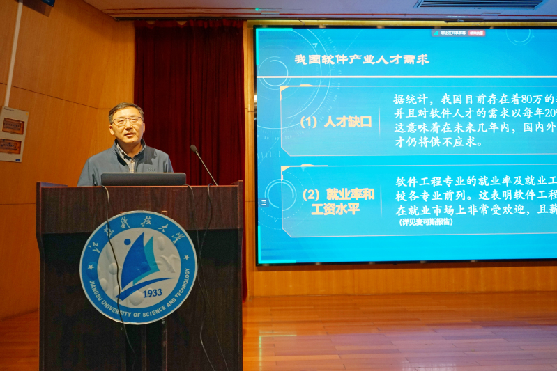 在分析行业现状的同时,束鑫老师还回顾了学校软件工程专业的发展历程。从2010年首次招生以来,该专业历经十余年积淀,不断优化教学模式,强化师资力量,取得了“江苏省一流专业”这一殊荣。束鑫老师表示,这离不开专业团队的辛勤付出和学生们的共同努力。通过先进的教学体系和丰富的实践平台,学校在为学生打牢编程基础的同时,也注重培养他们的创新能力和实践能力,助力他们在软件领域脱颖而出。