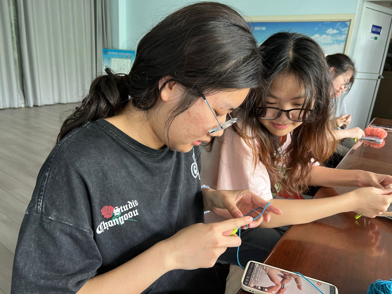 活动的顺利开展离不开2023级人工智能专业喻聪聪和余俊贤同学的悉心指导。她们从基础针法到复杂技巧,耐心解答每位同学的疑问,用专业与热情为活动增添了温暖与活力。